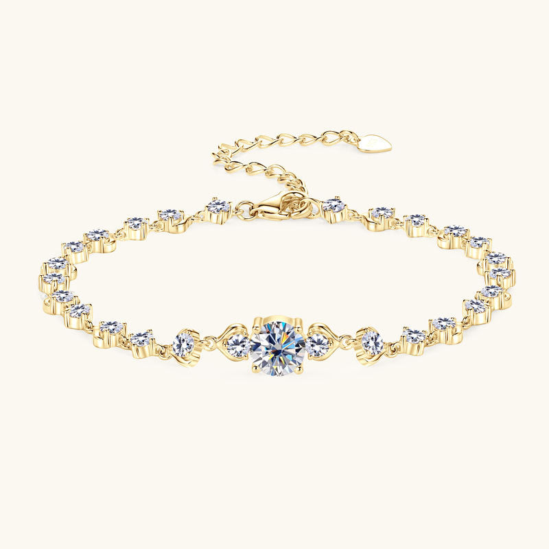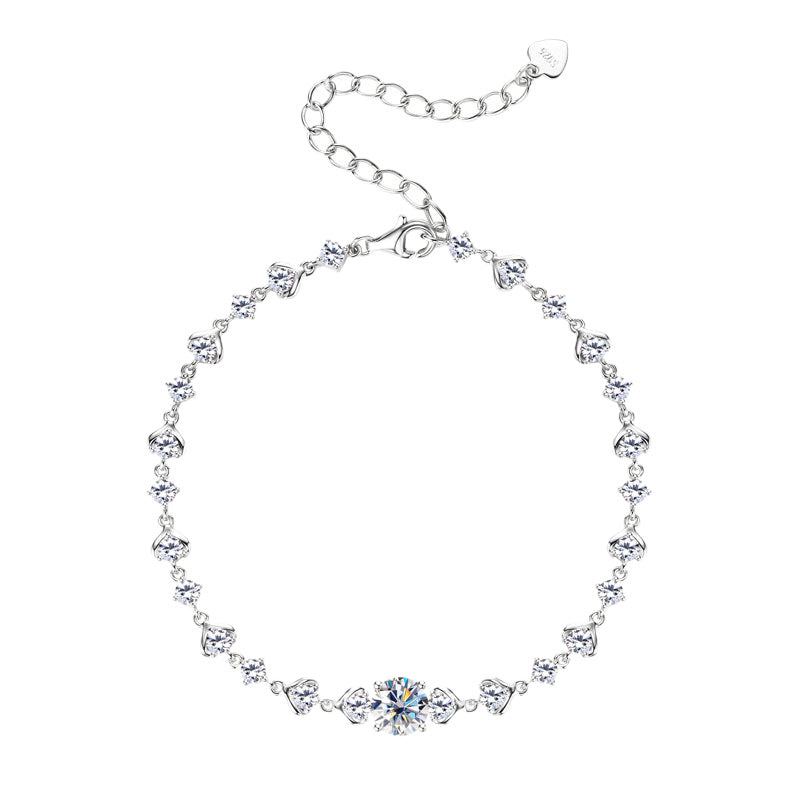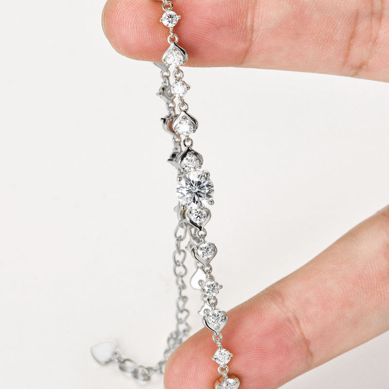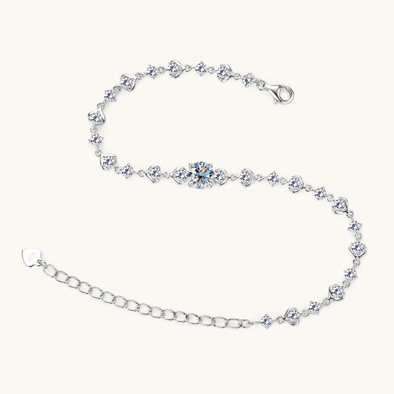 A delicate celebration of love and light, the ASN Aurora Heart Moissanite Tennis Bracelet is the ultimate symbol of elegance and romance. This stunning bracelet features a line of brilliant D-color moissanite stones, each set in heart-shaped bezels that add a subtle touch of whimsy and femininity. At the center, a larger moissanite stone radiates with breathtaking fire, making this piece a showstopper whether worn solo or layered.