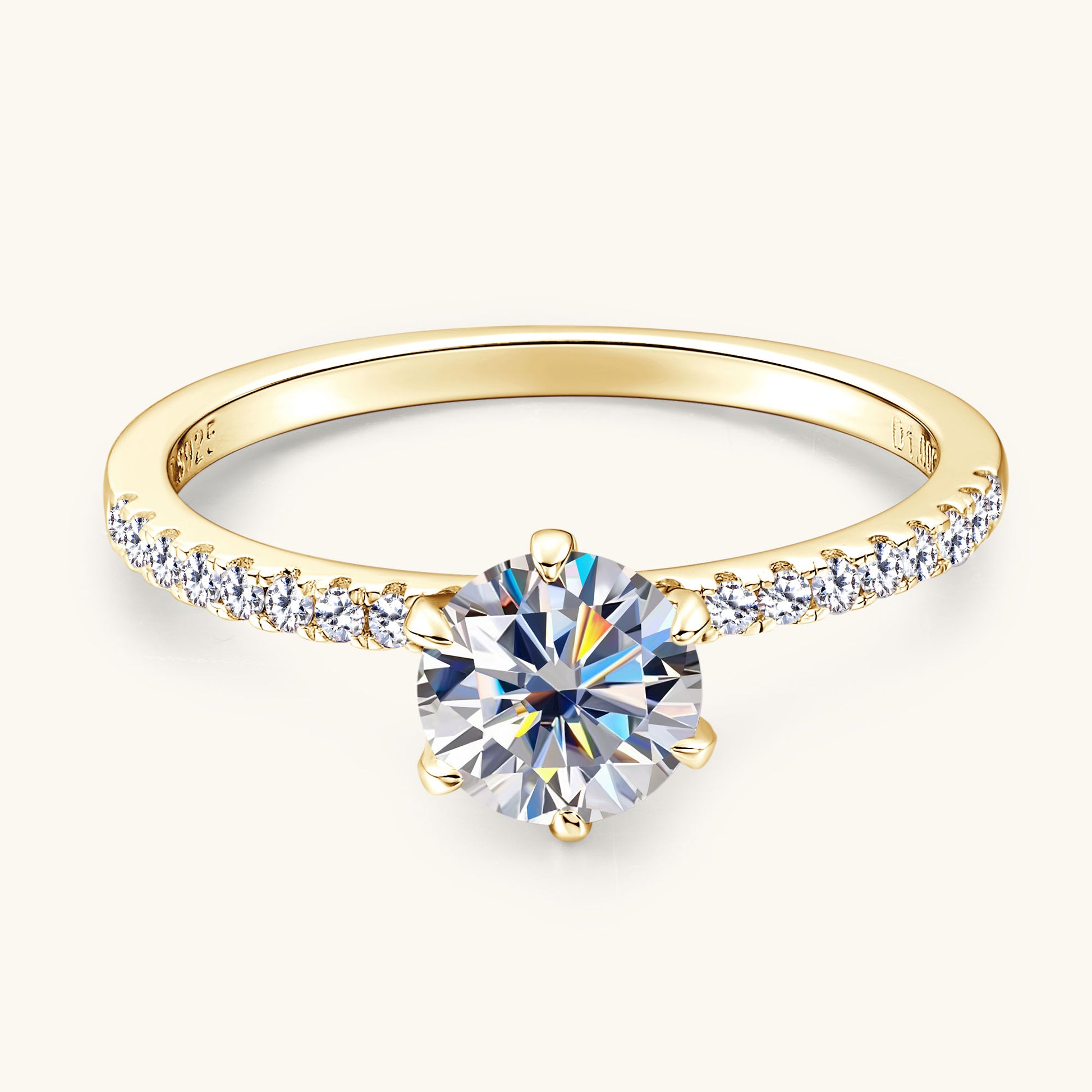A timeless symbol of devotion, the ASN Spark One Moissanite Ring captures the art of simplicity at its most dazzling. At center stage sits a 1-carat round brilliant D-color moissanite—chosen for its breathtaking fire and clarity—held gracefully by six prongs. The slender S925 sterling silver band, bathed in rich gold, is adorned with a line of pavé-set moissanite stones, ensuring every angle catches the light.